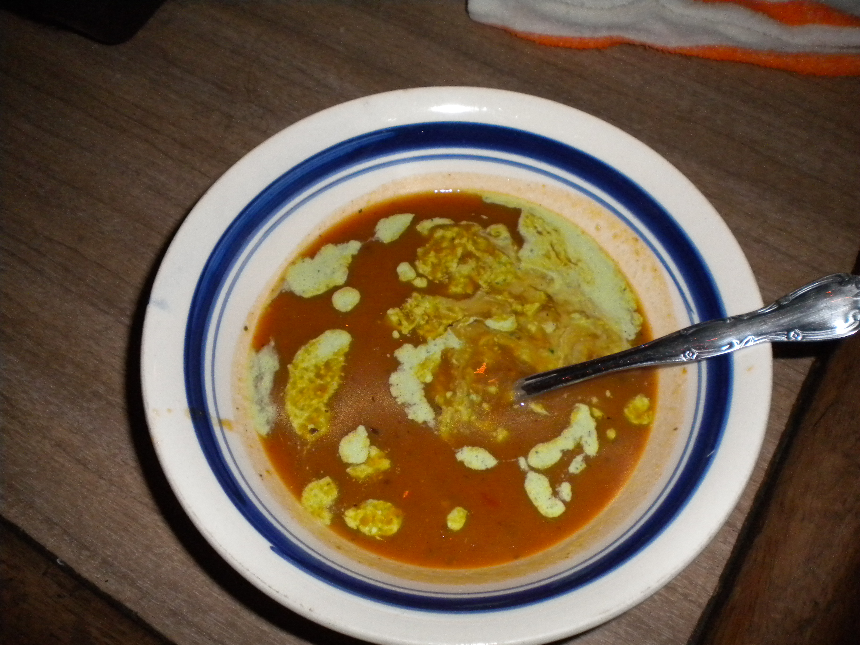 [Ed: This photo may not do much to advance my career as a food stylist, but this soup was very tasty, and the cilantro cream added a lovely cool counterpoint to the chile and cumin. ]