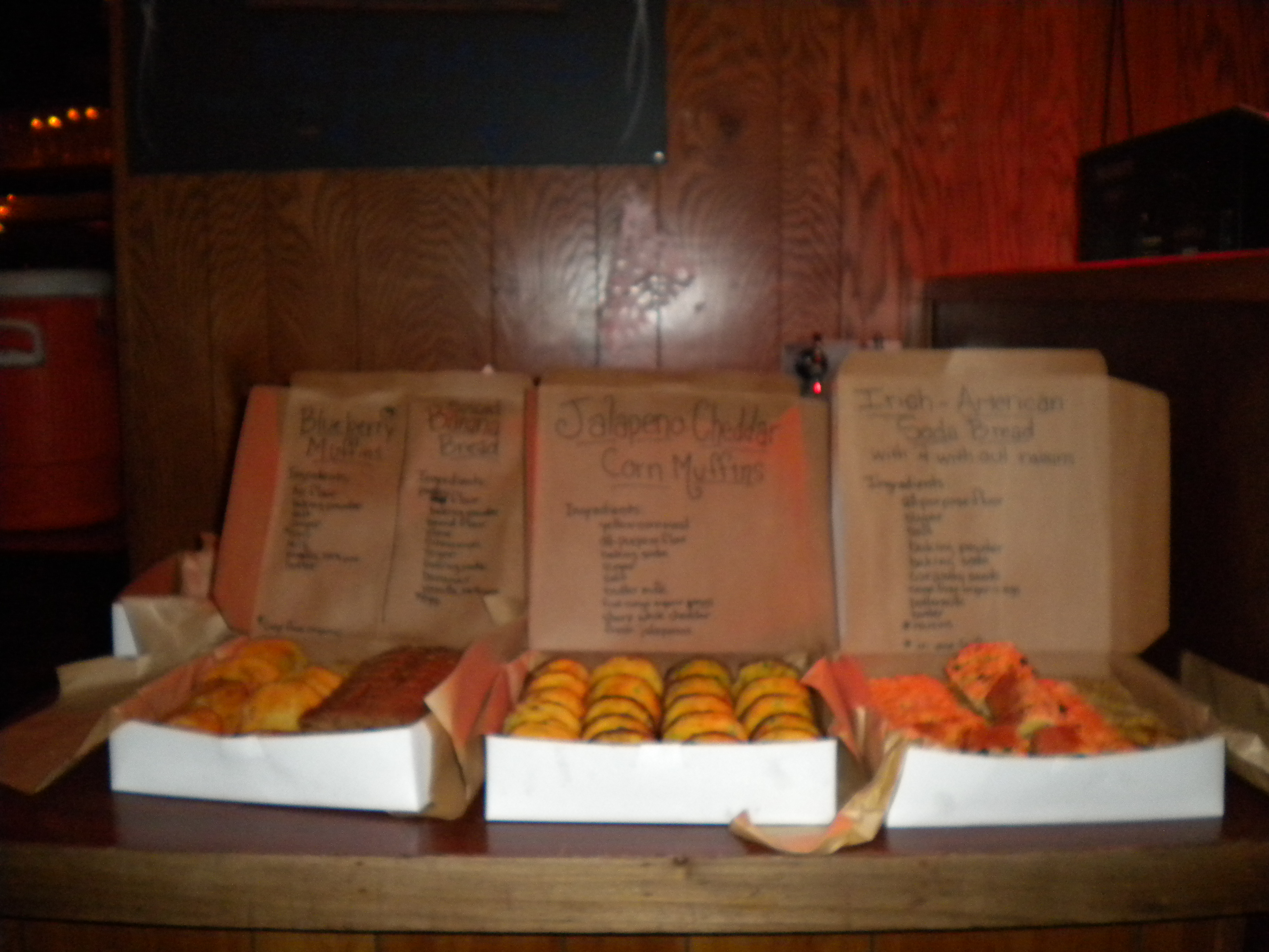 Rae started a new semester of culinary school this week, and supplied us with a amazing array of bounty, some of it homework, some of it just for fun. From left to right, there, we’ve got blueberry muffins, banana bread, jalapeno-cheddar-corn muffins, and Irish soda bread, both with raisins and without. Not shown, but very much eaten: molasses cookies and … some other little sugar cookie thing with jam filling.