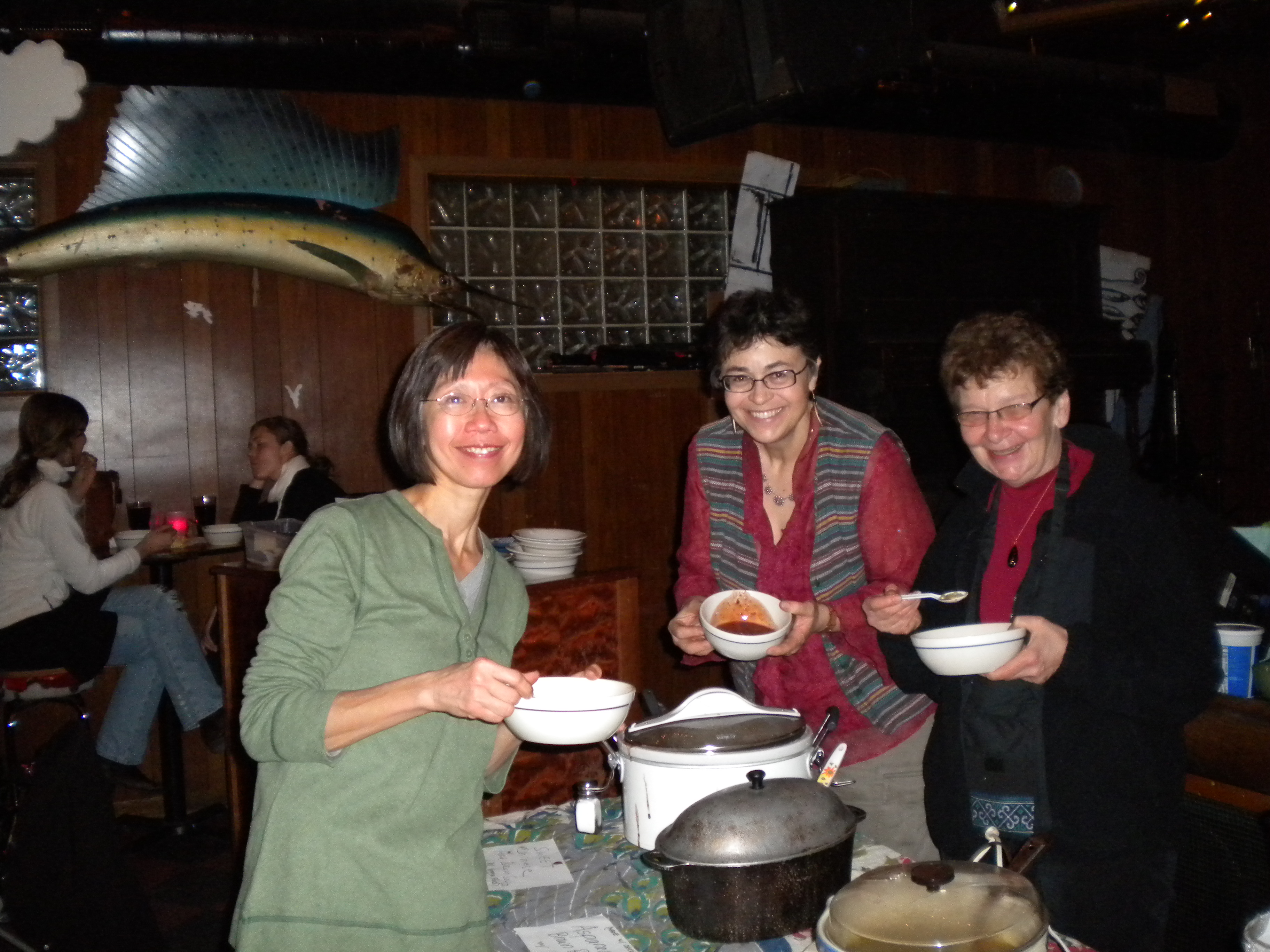 Just as my crock was starting to look a little bare, reinforcements showed up in the form of Rebecca Tung, Marianne Eberhardt, and Phyllis Dickstein. These three are Soup and Bread newbies who signed up to cook at the book release party; they delivered a trifecta of soup goods: hearty vegetable-beef (Phyllis), a thick and flavorful asparagus with brown rice (Marianne), and for dessert — whoa — a sweet Chinese red bean (Rebecca; think red bean ice cream, but hot and liquid).