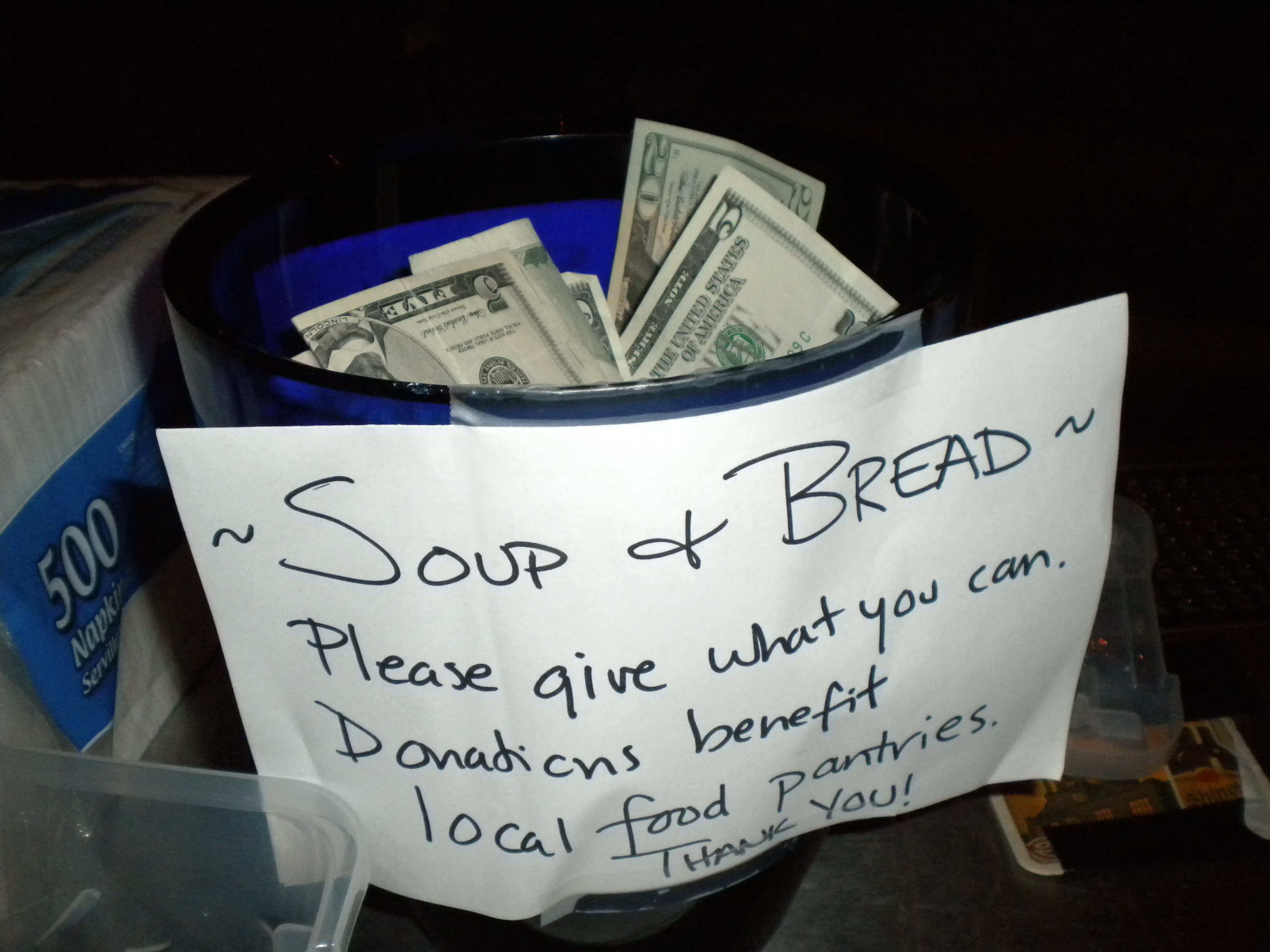 Charlotte Robinson, the Common Pantry board member who suggested her organization as a possible recipient of Soup and Bread’s weekly wad of only-slightly grubby bills, was in the house as well. I’m going to hook up with her later this weekend to deliver the $240 we raised, and take a little tour of their outfit. Hopefully I’ll have something more to say on that front soon.