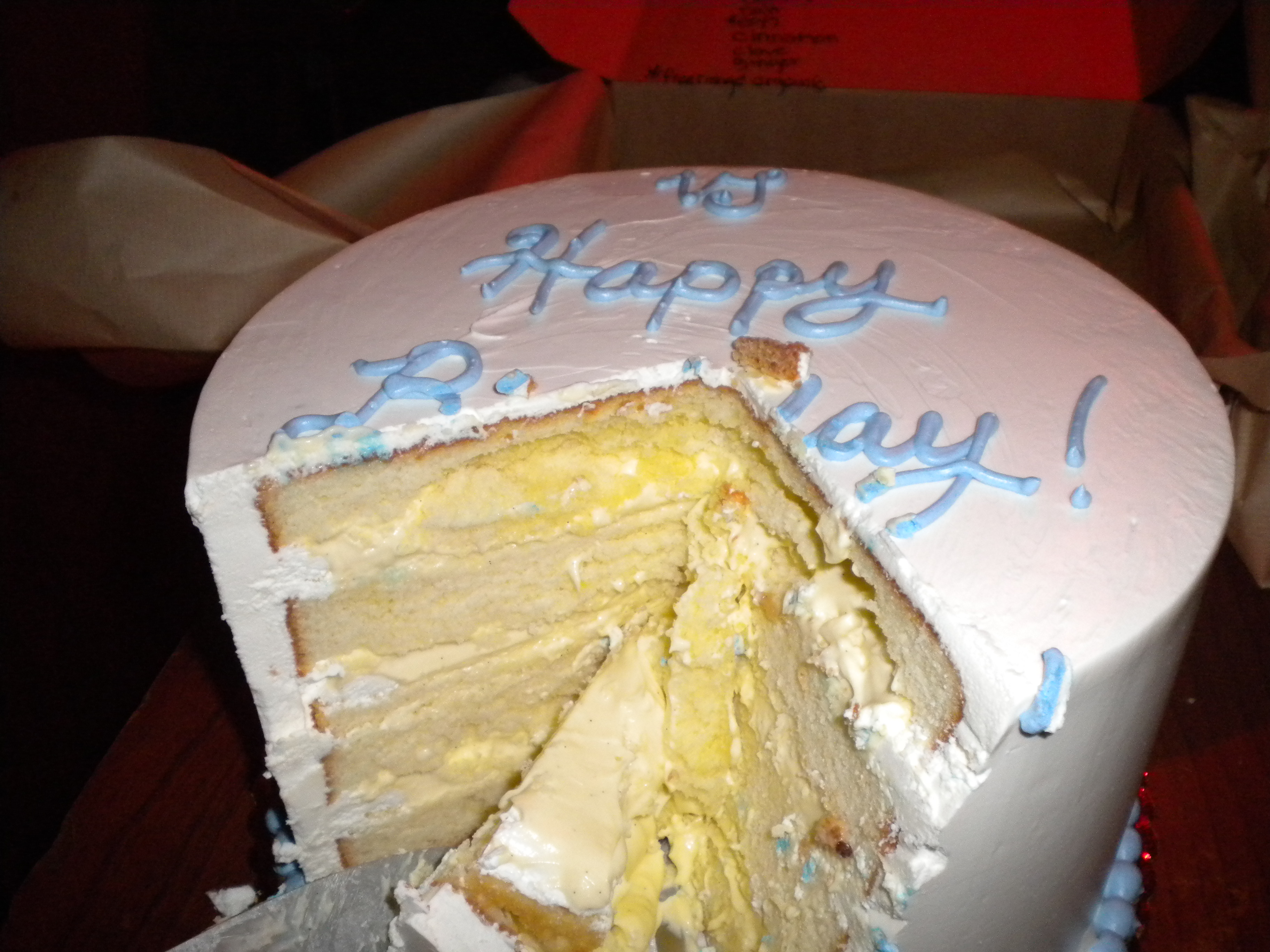 As if we didn’t have enough baked goods, Rebecca also provided a peanut butter bundt cake, and Celeste delivered (via Devon) an AMAZING birthday cake. For, um, me — and all the other Capricorns in the house. Lemon, with a whipped cream frosting (I think). It was delish, and huge! (In honor of looming birthday, I also received quite possibly the cutest birthday card ever from Anastasia’s son Beckett. Seriously, it nearly made me cry. If only he were 40 years older … )