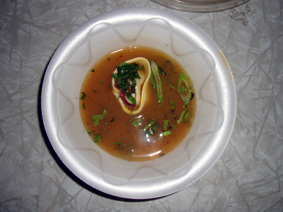 Steam or simmer tortellini until filling is cooked all the way through. Place 4 tortellini in the bottom of a soup bowl. Add a few slices of pork belly and a few pickled shiitake mushrooms, arranging in an attractive manner. Sprinkle a pinch each of culantro, Thai basil and scallions in bowl. Present to your guests. At the table, ladle hot pork dashi into each bowl. See the goodness. Smell the goodness. Taste the goodness. Feel the goodness.