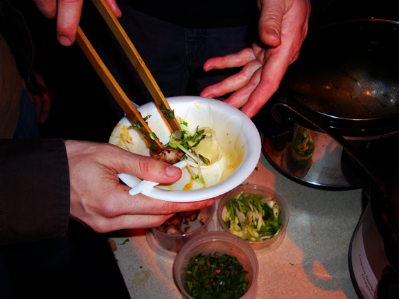 [Ed: This lovely soup may be rather involved, but the complex, delicate results are well worth the effort. Says Hugh, “Dashi is a basic stock used ubiquitously in Japanese cooking. It gets much of its flavor from kombu, a dried kelp that lends the stock its salty, nearly meaty backbone and katsuobushi, dried, fermented and smoked bonito tuna flakes. In this adaptation, influenced by David Chang’s Momofuko, I wanted to go for a more porky, meaty flavor, so I omitted the katsuobushi and pumped things way up with pork neck bones, chicken bones (if you can find chicken backs, or are in possession of a chicken carcass, this is best) and a few cubes of concentrated lamb stock I had in the freezer. All ingredients can be found in an Asian market. Don’t worry if you don’t have frozen cubes of various meat stocks in the freezer.”]