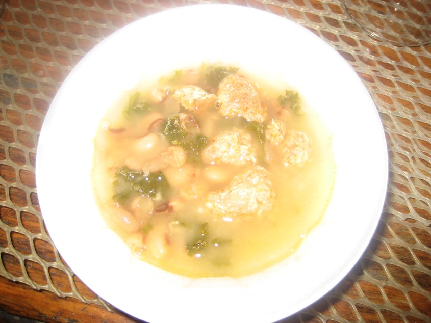 [Ed: I’m pretty sure this is Terri’s soup, and not the parsnip with turkey meatballs, but it’s a little hard to tell. Apologies for the blown-out photo. Really, I’m buying a new camera today. Terri — whom I first knew way back in our heyday as disaffected Pacific NW teens, and whom I reconnected with more recently here in Chicago — based this soup on one she used to make at The Sisters restaurant in Everett, Washington. Here’s what she says about it: “Usually, I’m a bean soaking, stock making kind of gal. But with 75 papers to grade this week, my usual from scratch ethic did not happen. For this week’s Soup and Bread, I turned to a soup that can be hurried along by using canned ingredients. At The Sisters we made our own stock. I hope they don’t think less of me.”]