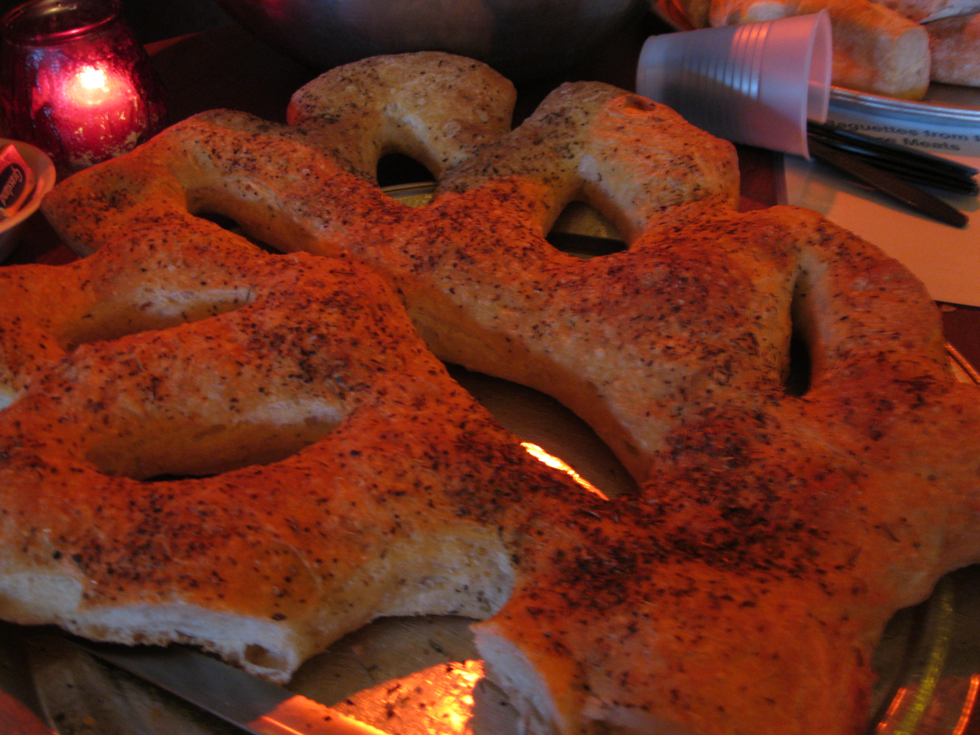 The quarter’s over at Illinois Institute of Art, so no more experimental challah or addictive cheese bread from Chef Kraus’s students. But our friends at La Farine continue to supply us with starches. This, above, I believe is a ciabatta, shaped into lovely, branchlike form and dusted with pepper, poppy, paprika (?) and I’m not sure what all else. And Kim Soss brought hamentashen!