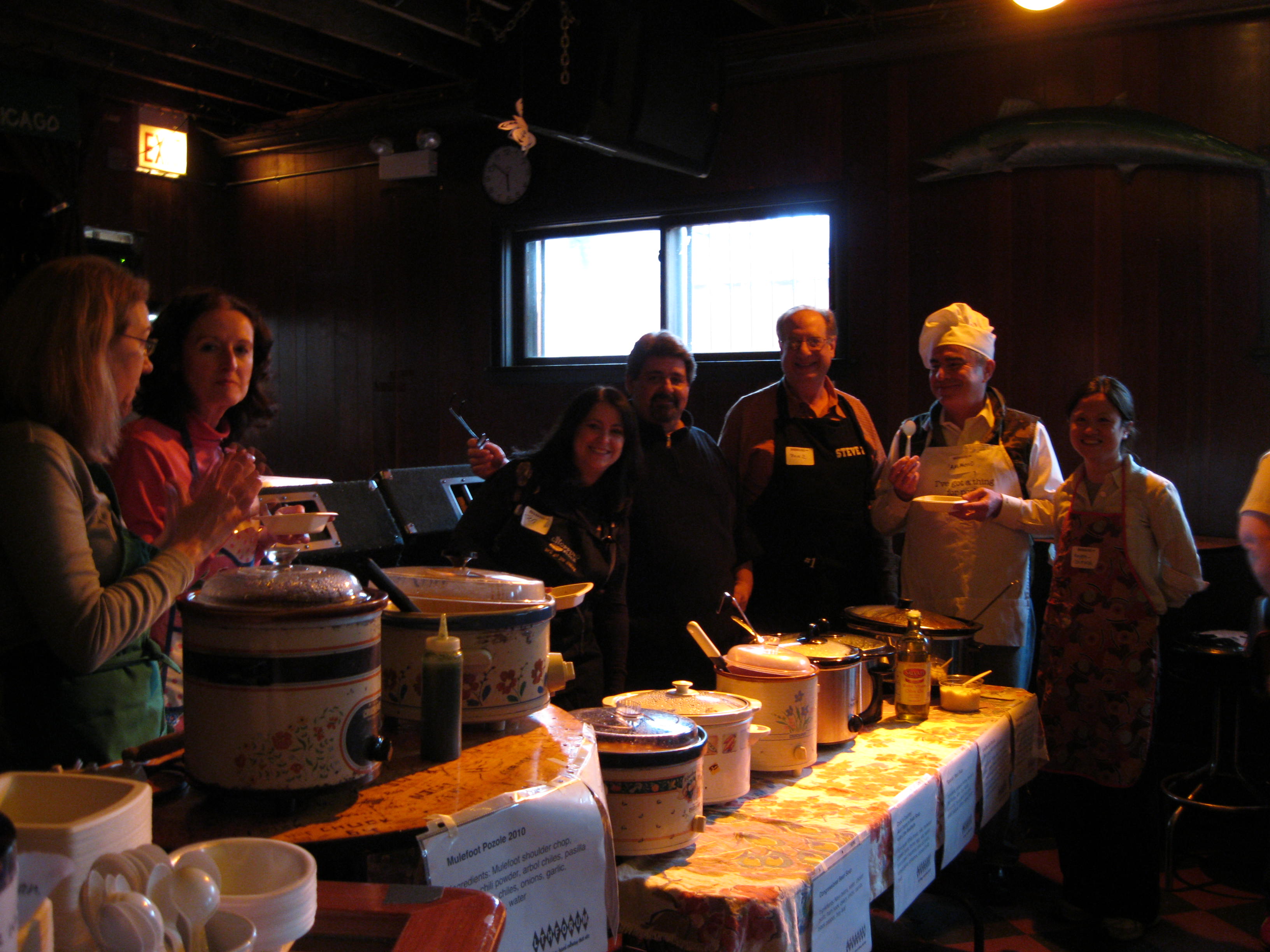 Our soup cooks this week came to us from the ranks of LTH Forum — “the Chicago-based culinary chat site.” LTH’er Sharon Bautista organized a mighty crew of eight, who came bearing crocks and coolers loaded with seven fantastic soups, not to mention premade signage, ladles, paper towels, cornbread, baguettes, and I don’t even remember what all else.