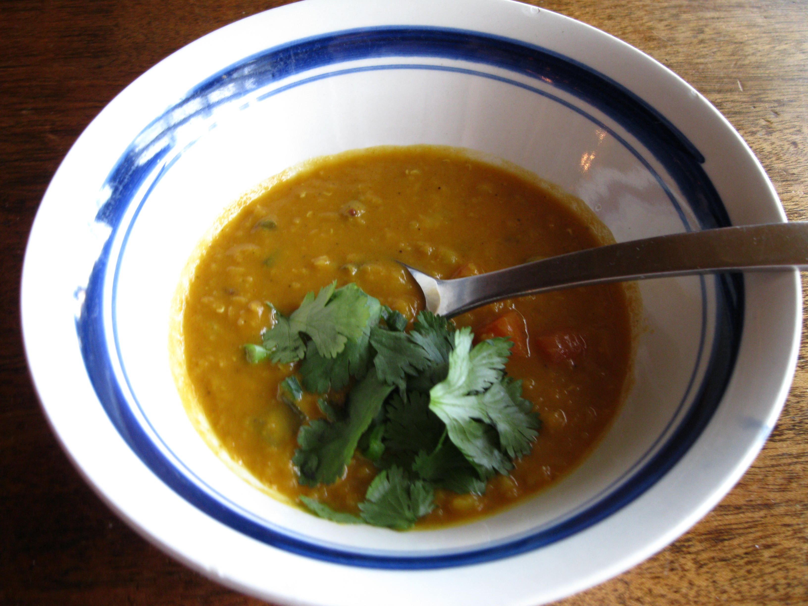 1 cup yellow split peas 1 cup red split lentils (masoor dal) 7 cups water 1 medium carrot, cut into 1/2-inch dice 2 tablespoons fresh peeled and minced ginger 2 tablespoons curry powder 2 tablespoons coconut oil 8 green onions (scallions), thinly sliced 1/3 cup golden raisins 1/3 cup tomato paste 1 14-ounce can coconut milk 2 teaspoons fine grain sea salt 1/2 teaspoon (or more) cayenne pepper one small handful cilantro, choppedPreparation