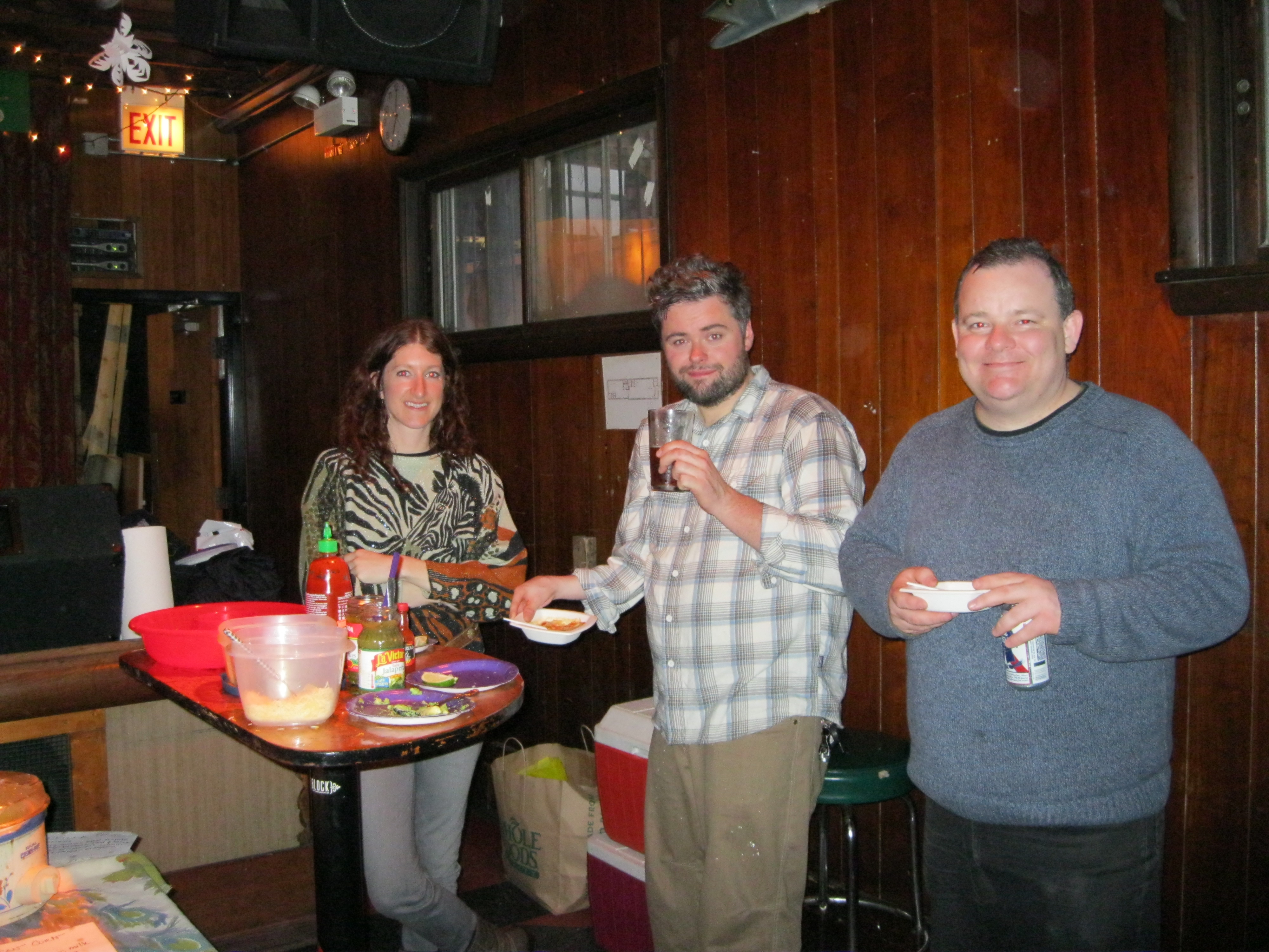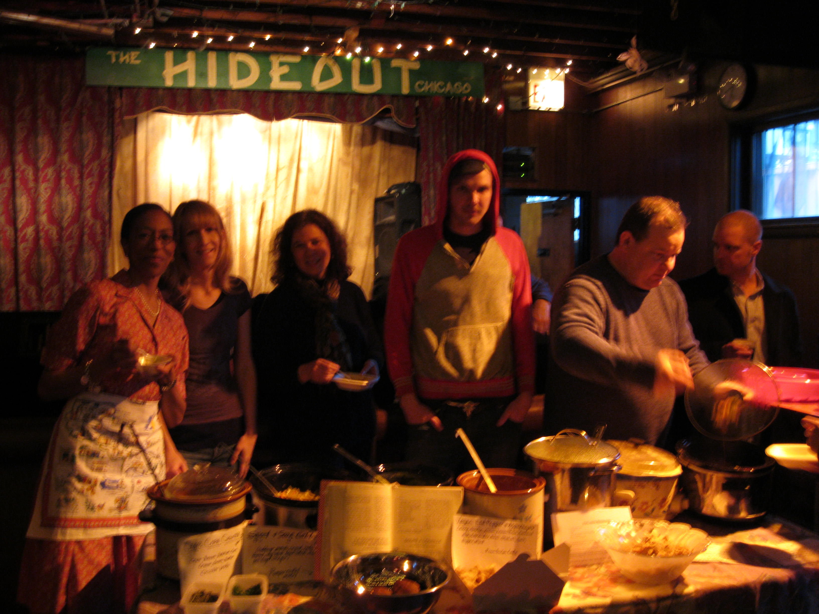 Next to Terra is Drew, an emissary from Swim Cafe, which provided a really amazing vegan red pepper soup made with asparagus and sweet coconut milk. People are clamoring for this recipe, Karen! And over there on the end, and above in close up, is the crew from Hard Boiled Records in Roscoe Village. Sadly, I cannot remember everyone’s name. But owner Mark Ferguson (above, right) rounded up a posse to cook and help serve their Mexican corn soup and a last-minute tortilla soup, made after a beef stew went south in a horrible accident of salting. They also raised the bar for garnishes; we had to annex an extra cafe table to hold all the cheese, cilantro, and tortillas!