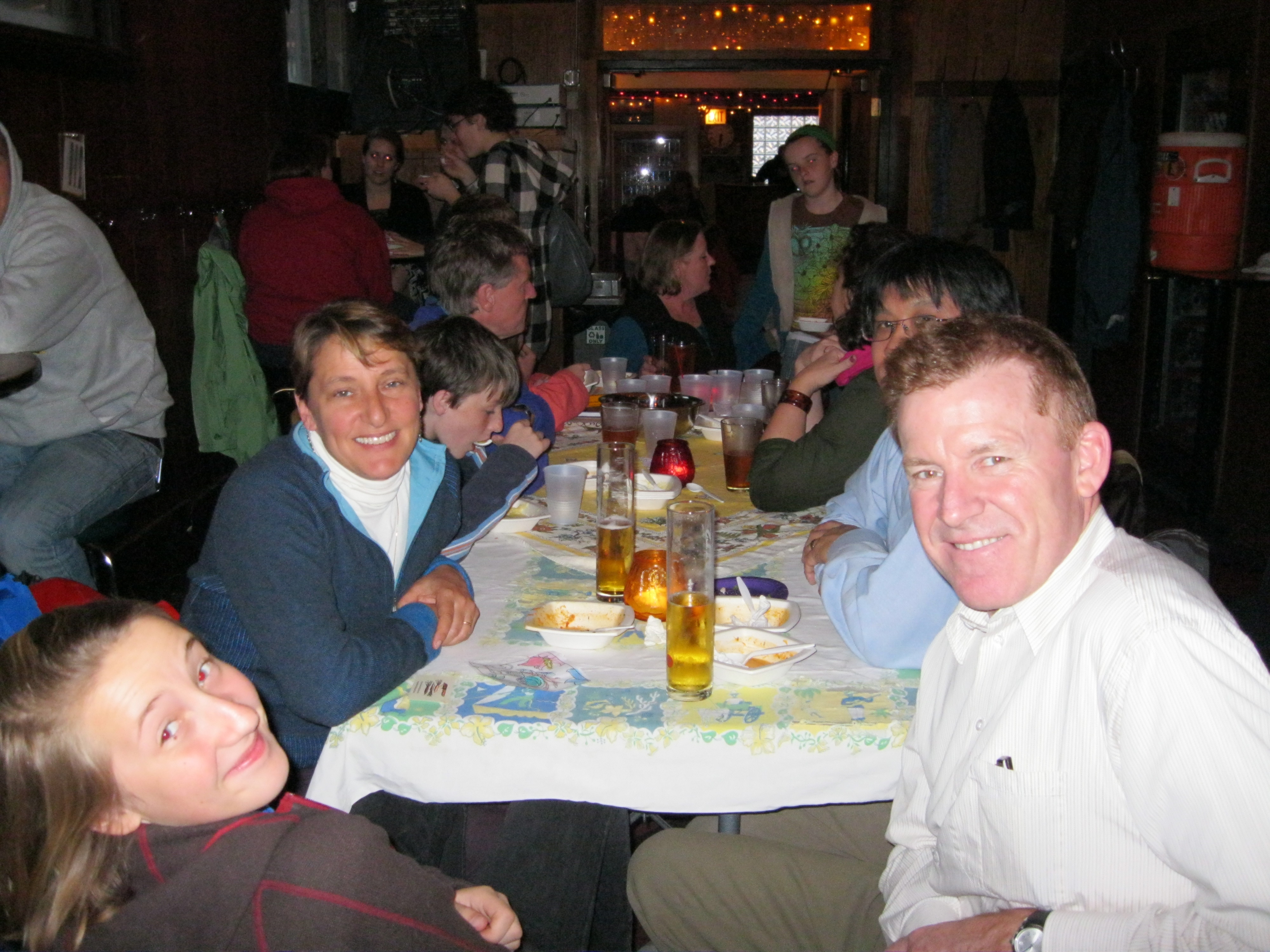 Here, in the thick of it, are our valiant band of cooks. There on the left is my former coworker Lisa Martain Hoffer, who turned up with family in tow, toting a pot of crab corn chowder; next to her is artist, pastry chef, and massage therapist Deana Burrows with sweet and sour cabbage soup accessorized with a bowl of pumpernickel nuggets. And next to them is Terra Brockman; Terra is the executive director of the Land Connection, and her book, The Seasons on Henry’s Farm, a lyrical look at a year in the life of her brother’s central Illinois farm, is one of three finalists for a 2010 James Beard Award. She’s a great writer and, unsurprisingly, an excellent cook! She brought along a sorrel soup made from greens picked the day before from, yes, Henry’s farm — and her partner Joel Smith brought a soup as well, a rich spin on avoglemono soup he billed as “Greek, Jewish, Mexican soup.” Mexican because he garnished the thick blend of chicken, lemon, and rice with some crumbled-up tortilla chips.