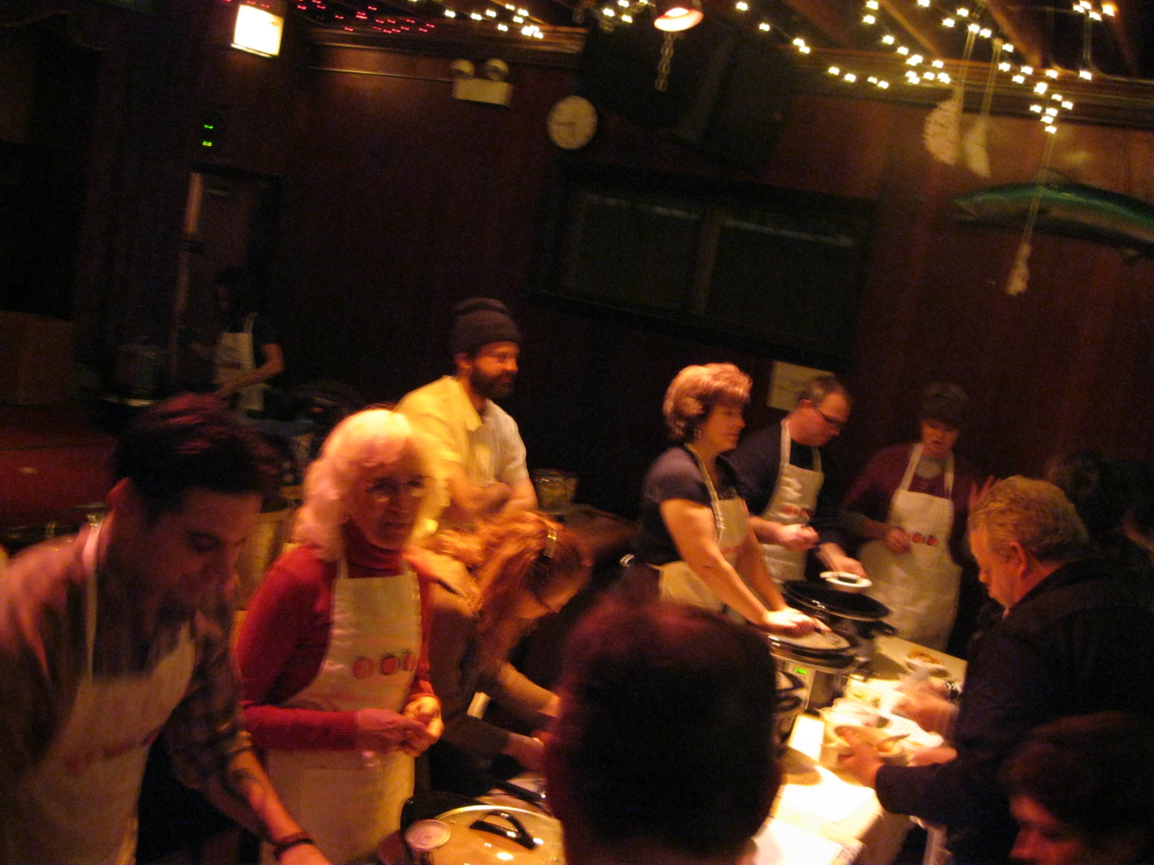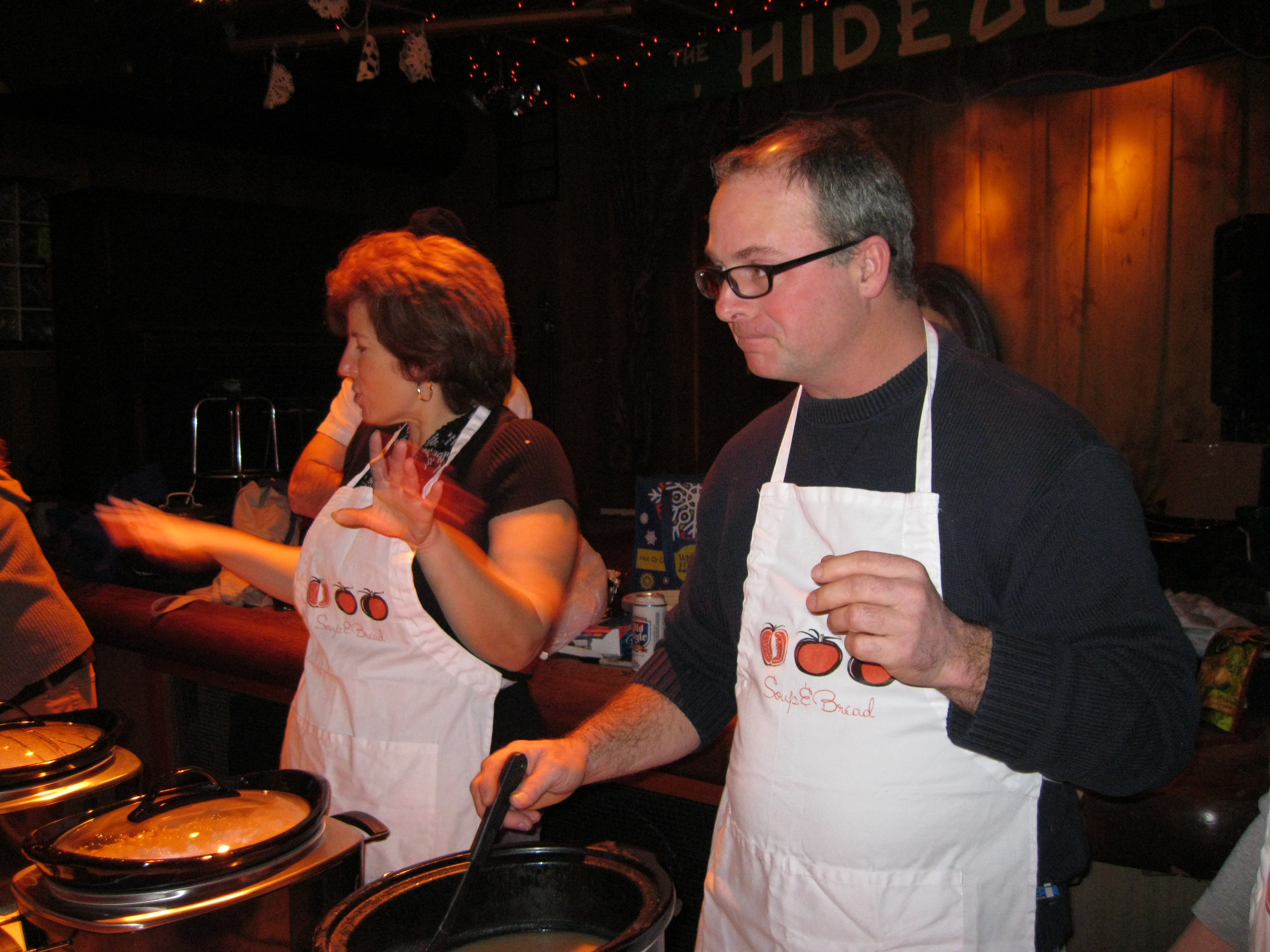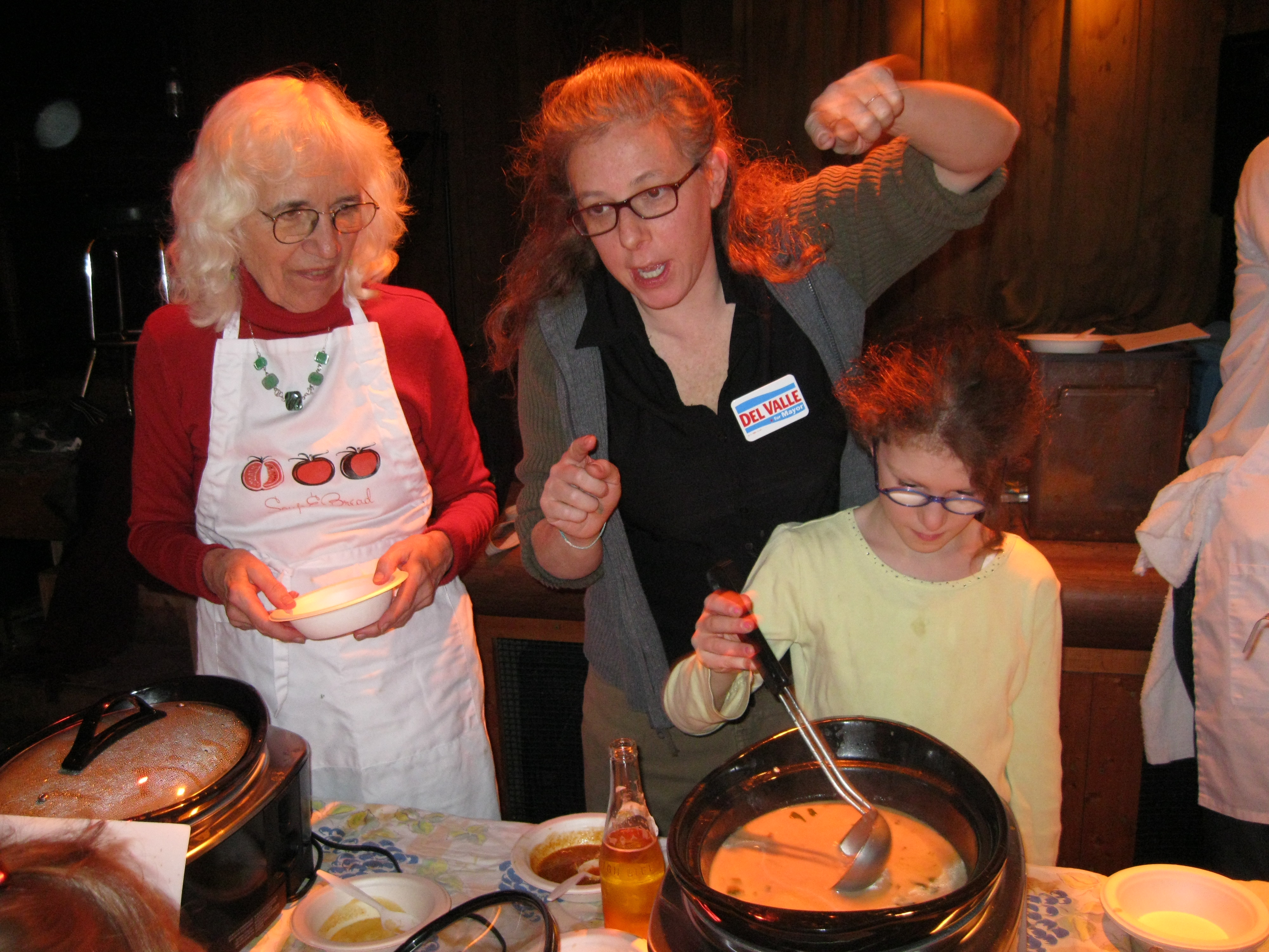 Maggie Kast, who delivered a fierce recreation of a classic Provencale-Style Fish Stew, watches while Paula Ladin (with help from Lucy) dishes up her “Little Bit of Everything” Soup. (Motto: “When in doubt, add more cream”)