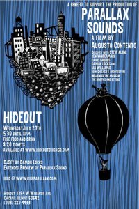 OR, you can come to the Hideout from 5:30-8 PM on the 27th and enjoy FREE BEER (and possibly wine) plus pizza from Pizza Metro, while you listen to a DJ set from Damon and watch a 20-minute preview of the film. For just $20 clams! Because, c’mon – it may not be world hunger, but art is always a good cause. And, hey! Stick around afterward for the Immediate Sound Series’ CD release party for Starlicker, aka Rob Mazurek, John Herndon, and Jason Adascewicz.
