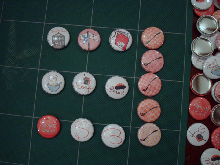 Friend of Soup & Bread Liz Tamny, whom you may recall from such previous previous projects as this gorgeous poster, spent all last night making these adorable buttons for our book release party. Ten different kinds! Current supply (relatively) limited; come early and get ’em while you can.