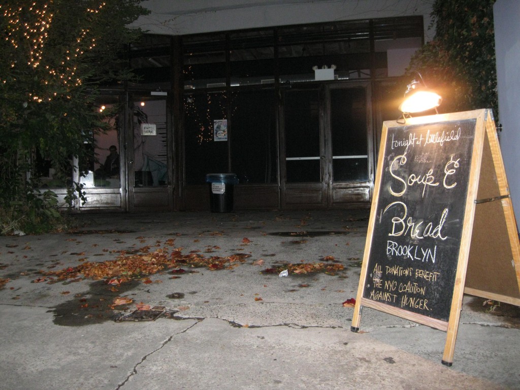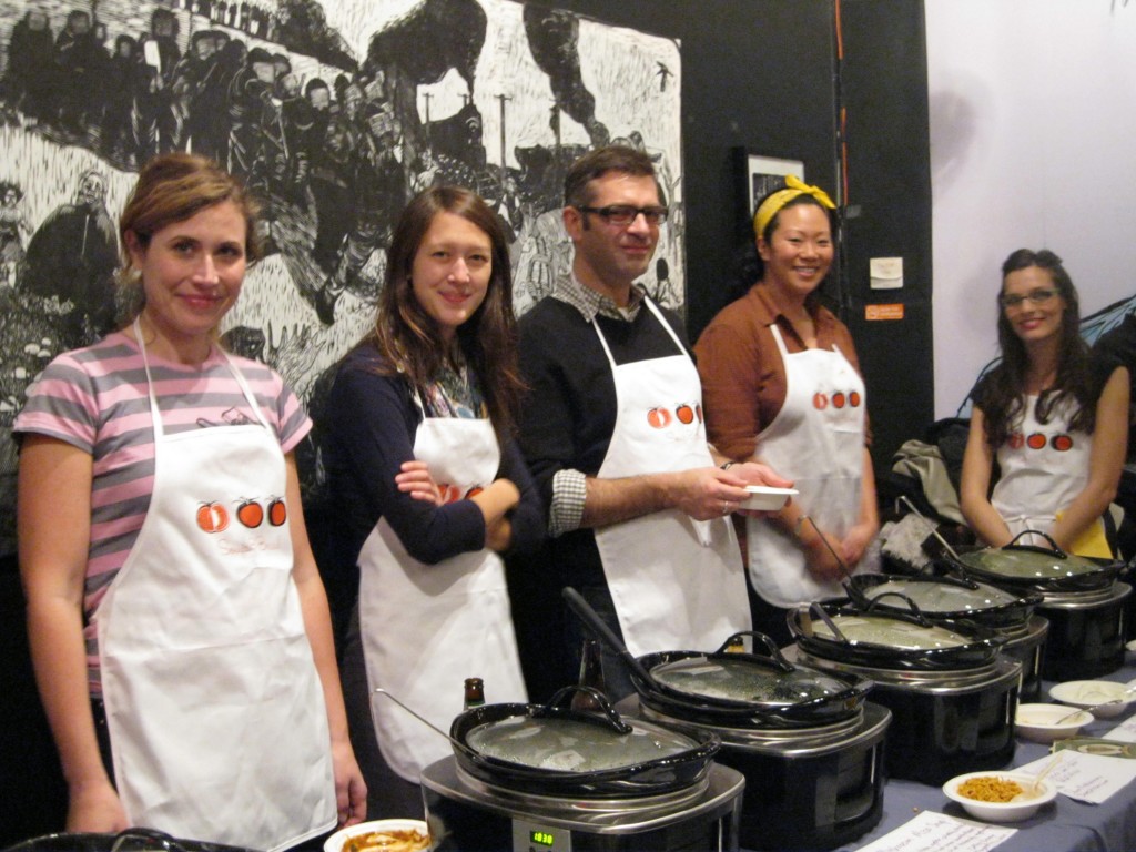 As our soups warmed, we heard reports that Occupy Wall Street had shut down the Brooklyn Bridge a mile and change away; I got multiple texts that night from friends on the bridge who couldn’t — and didn’t want to — leave. But some of them did make it to Littlefield later, to join the friends and the curious who came out to sample soup from an all-star cast of cooks. Above, from left, are food writers Raquel Pelzel, Cathy Erway, and Dave Klopfenstein, with Caroline Hahm — most recently of M. Wells — and Alexis (crap. last name?) from Jimmy’s No. 43 in the East Village.