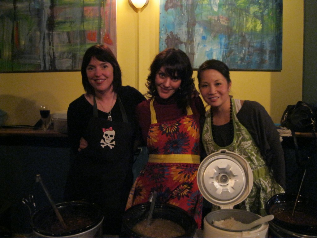How can you resist a recipe when the first ingredient on the list is “one rotisserie chicken”? Melissa, another Milwaukee cook, is a massage therapist by day, and appears to own a collection of sweet vintage aprons. I didn’t get a decent photo of her cheesey chili – one good for a hearty winter meal – but here’s a cute pic of the cook, center, flanked by her friends Kate and Tyan. Thanks ladies!