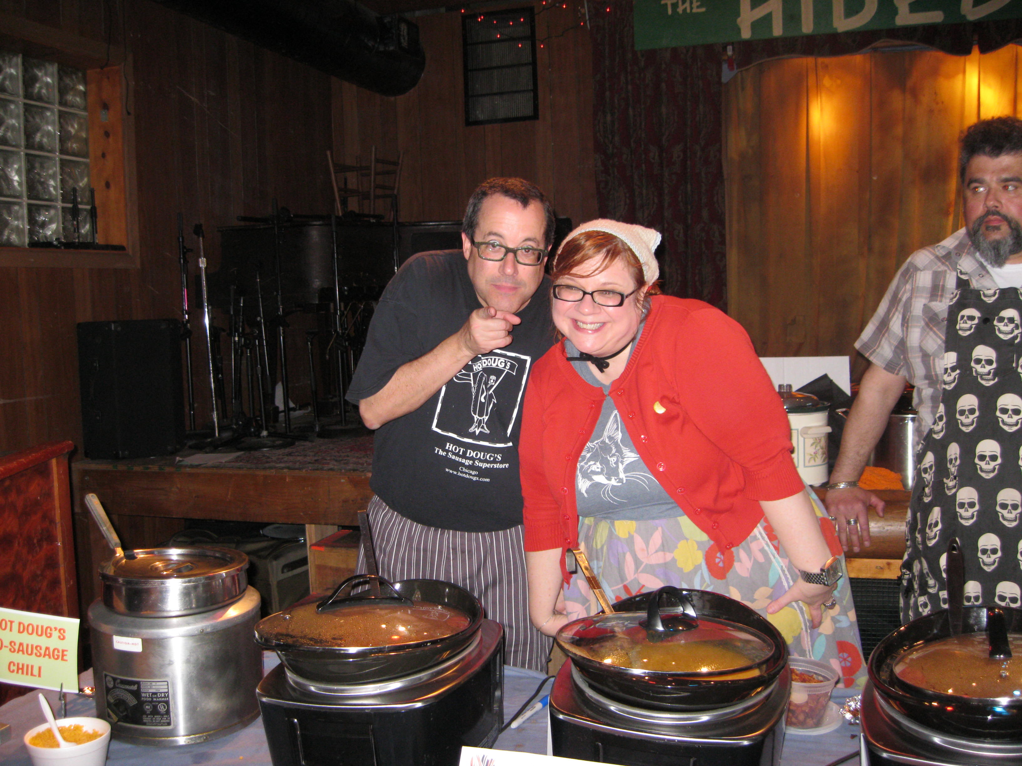 Turnout was light — really, who could blame you — but we still had a fun, and surprisingly generous crowd. In addition to the power bloc of cheese we had a vegan carrot-ginger from Susannah Strang, spicy pork posole from Chris Turner at the Butcher and Larder, and a return visit from “Hot Doug” Sohn (above, with Sheila), toting a vat of his famous 40-sausage chili.