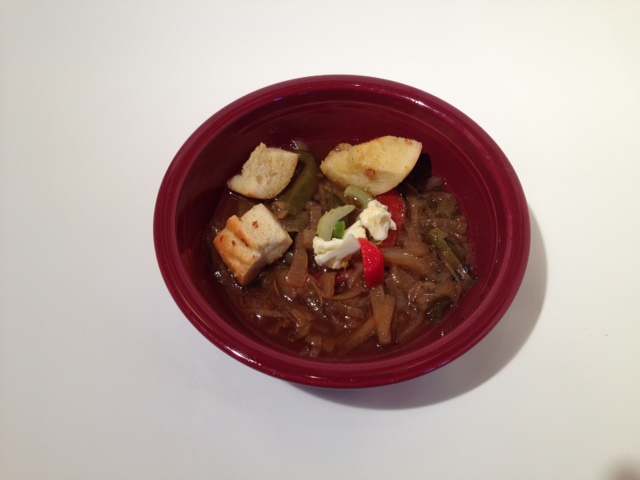 Once the onions are caramelized, add sherry to deglaze the pan. Scrape the onions, all the brown bits, and any liquid into a stock pot. Turn heat up to high and add the beef stock, sliced peppers, and thyme. Stir and bring to a boil. Turn heat down to medium low and simmer for 30 to 40 minutes, stirring occasionally.