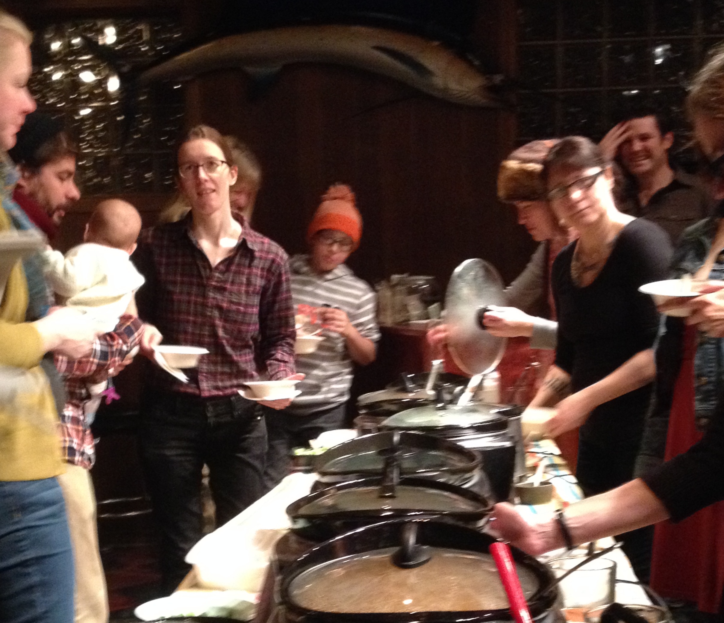 “My two cents is that everyone in the room, both soup servers and people coming to eat soup, were THRILLED to be out of their own abodes but somewhere warm, cozy, lively. The theme of Fire and Ice couldn’t have been more fitting as we were all emerging from the Polar Vortex. People were just so grateful. IMHO Louisa gets the award for most interesting soup. It had ramen, American cheese, kim chi, it was wild and people were digging it. Had a fun name to boot, something like Korean General’s Soup.”