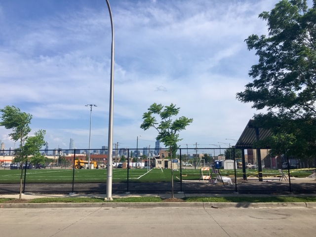 IMG_0552Anyway, as you may have heard the area around the Hideout is being redeveloped as a massive commercial/ residential/ entertainment complex. The lot where snowplows and garbage trucks used to idle, and where the Hideout Block Party took place for years, has been cleared and laid with a temporary thin layer of turf, creating a youth soccer field for the summer. In the fall, I guess it will get dug up again — unless this lawsuit aiming to block the creation of the Cortland and Chicago River TIF District manages to slow things down. (I wrote about all of this for the Baffler earlier this year.)